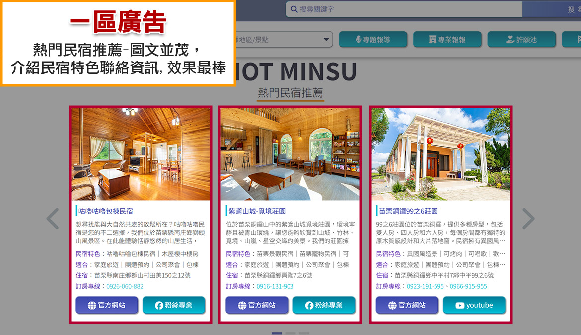 🚀 立即加入宜蘭民宿推薦王,提升您的民宿網路曝光,吸引更多旅客預訂! 想讓您的包棟民宿、親子友善住宿、寵物友善旅宿、特色Villa、海景/山景民宿、溫泉民宿在網路上被更多旅客看見嗎?宜蘭民宿推薦王提供完整的民宿資訊刊登服務,包括: ✅ 詳細民宿簡介 – 讓旅客快速了解您的特色 ✅ 客房介紹與設施 – 提供高品質住宿體驗 ✅ 房價與優惠方案 – 清楚呈現價格資訊 ✅ 套裝行程與服務 – 讓旅客一站式預訂 ✅ 住宿須知與訂房資訊 – 簡單明瞭,提升轉換率 💡 SEO優化 + 關鍵字廣告曝光 我們擁有專業的SEO搜尋引擎優化技術,透過Google關鍵字廣告,提升您的民宿排名,讓旅客更容易在網路上搜尋到您的住宿! 📢 現在就填寫廣告刊登需求表單,我們將由專人聯繫您,協助您制定最佳的網路行銷策略,讓您的民宿曝光度翻倍,訂單暴增! 廣告刊登專線:0915-900-120